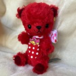 説明:渋めの赤モヘアに高級感のある素敵な柄生地を合わせました。おめめは色違いのぐるぐるボタン。左右で違う表情が楽しめます♪真っ赤なリボンと大きな勲章モチーフでおめかし。存在感のあるコです。